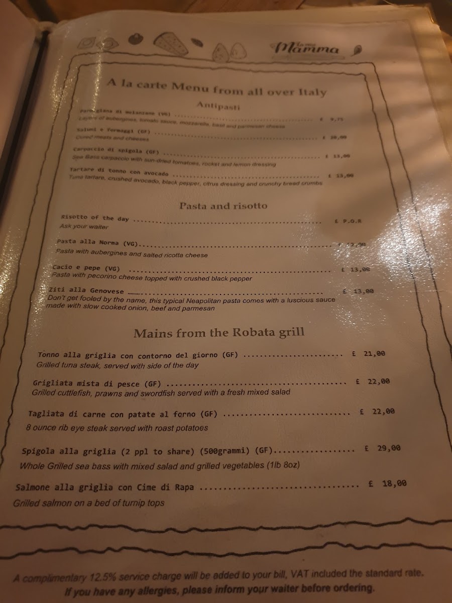 Start your meal with delectable Antipasti, featuring dishes like Parmigiana di melanzane and the aromatic Carpaccio di Sea Bass. For mains, the Tagliata di entrecote and Fritto Misto are standout selections, showcasing the rich flavors and generous portions that La Mia Mamma is known for.